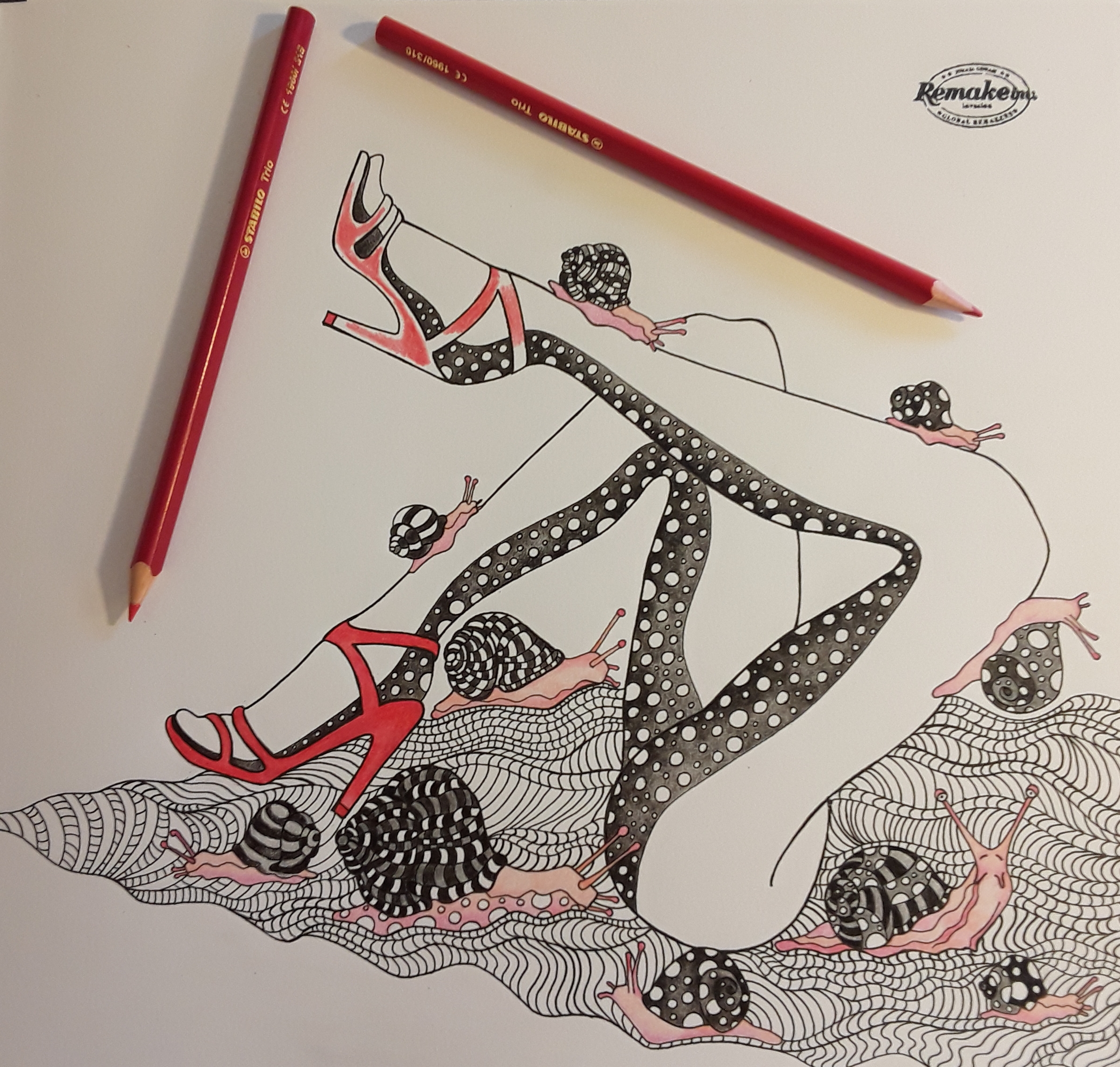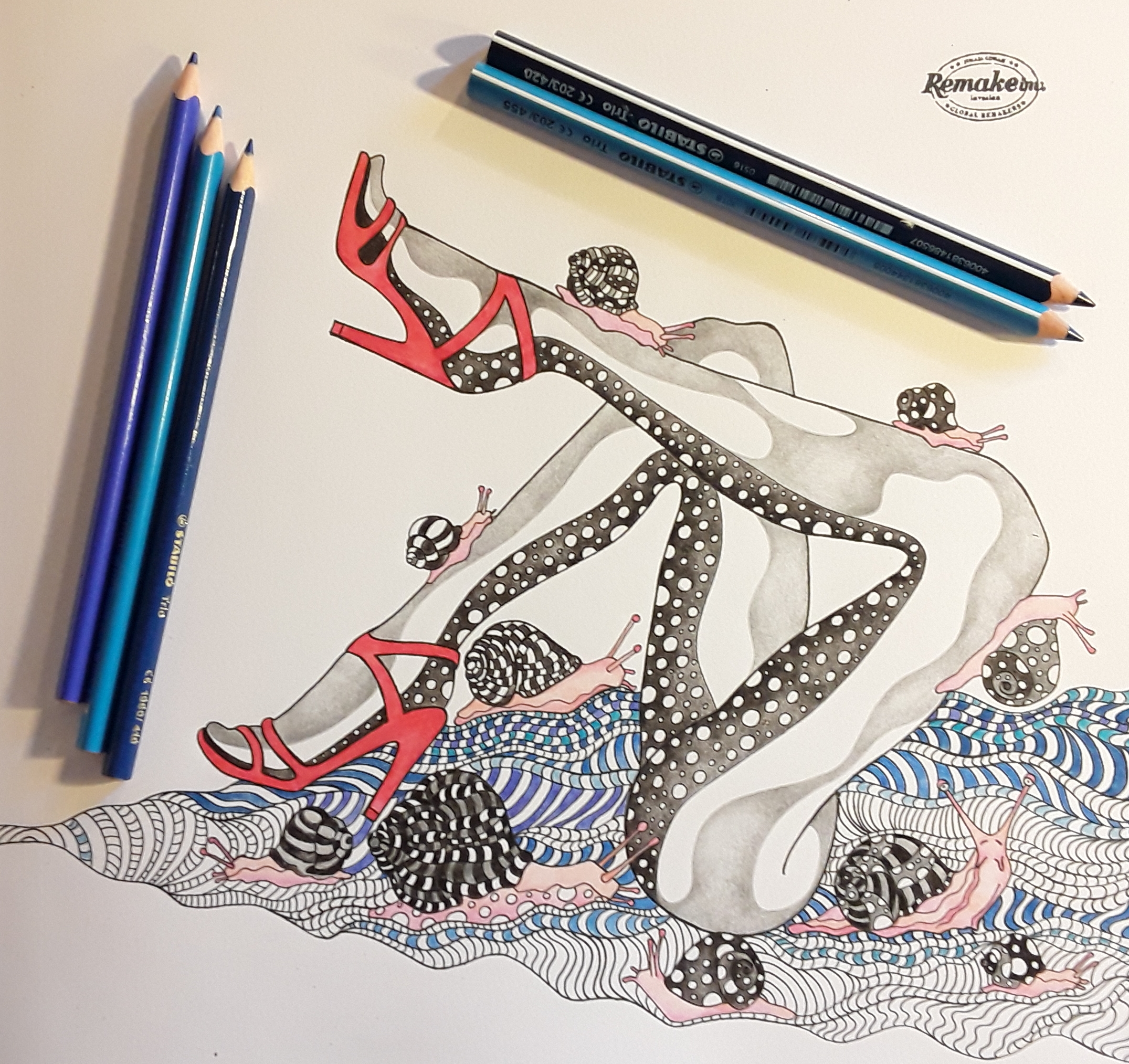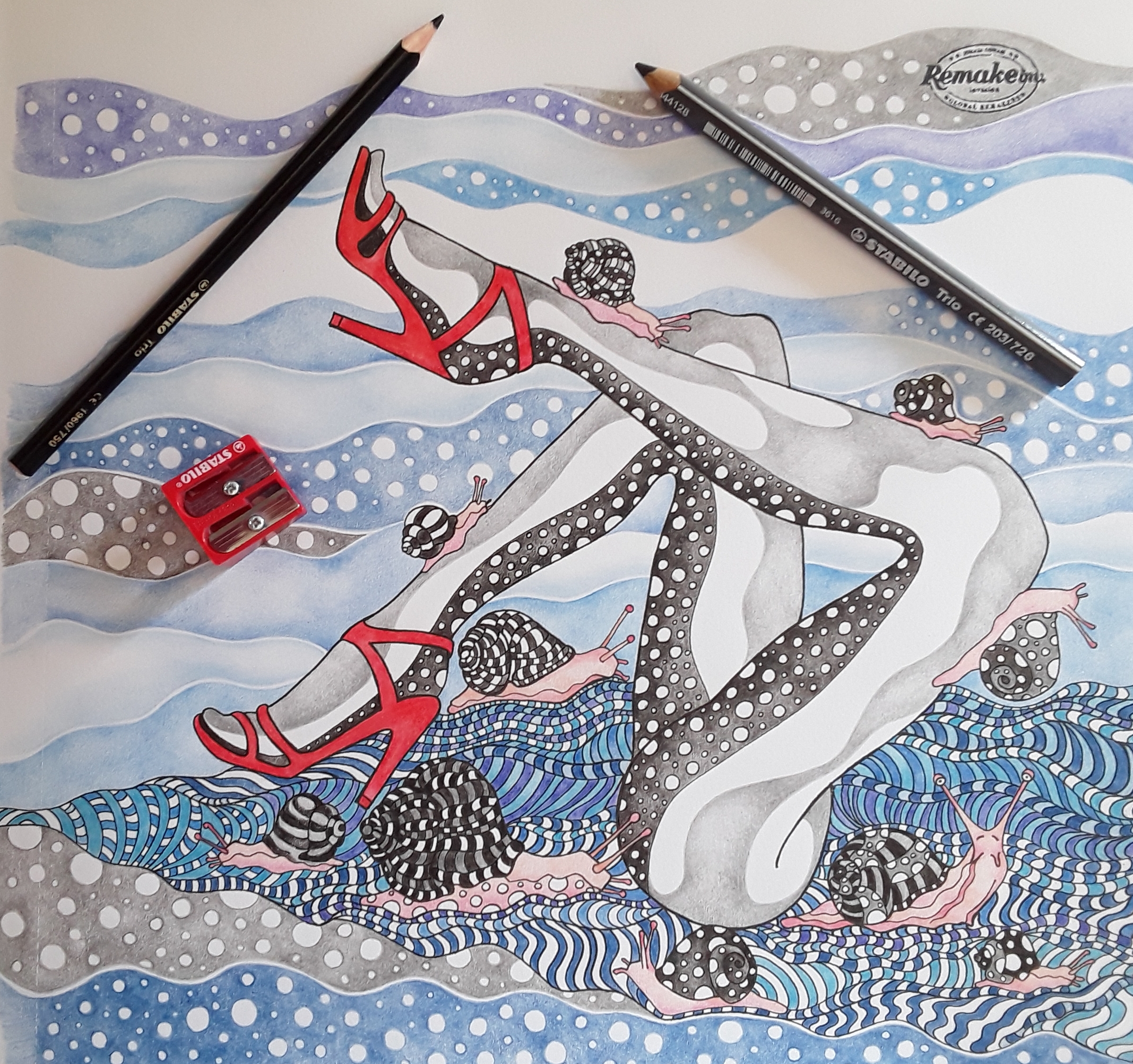 To testno ilustracijo sem si zamislila kot hladno monokromno sliko z rdečim kontrastnim poudarkom. Uporabila sem vse modre, črno in sivo iz palete STABILO Trio in Trio thick. Da sem dobila še več modrin in sivin sem barvice z nežnimi potezami mešala med seboj ter za svetljenje uporabljala tanko in debelo belo.