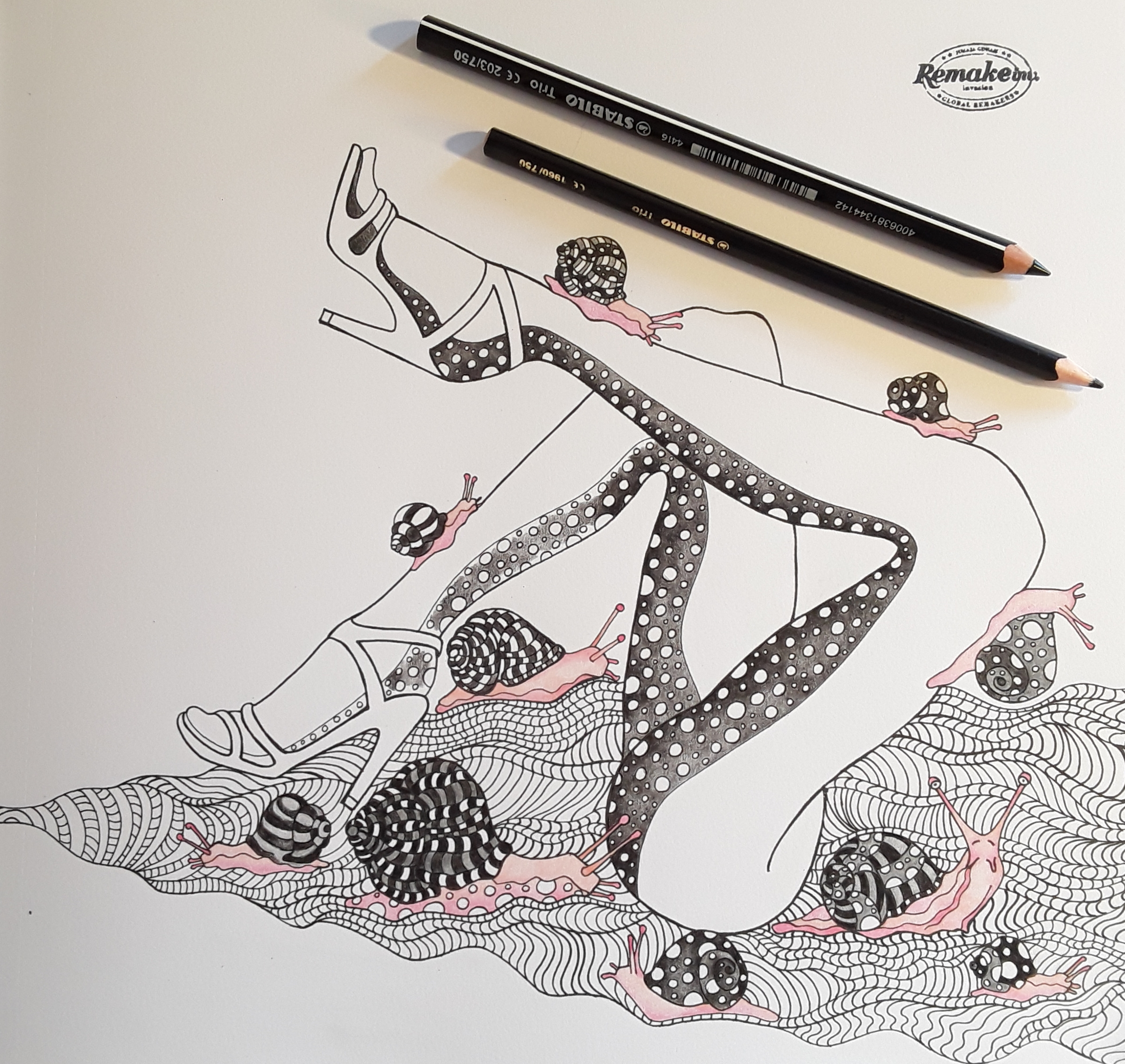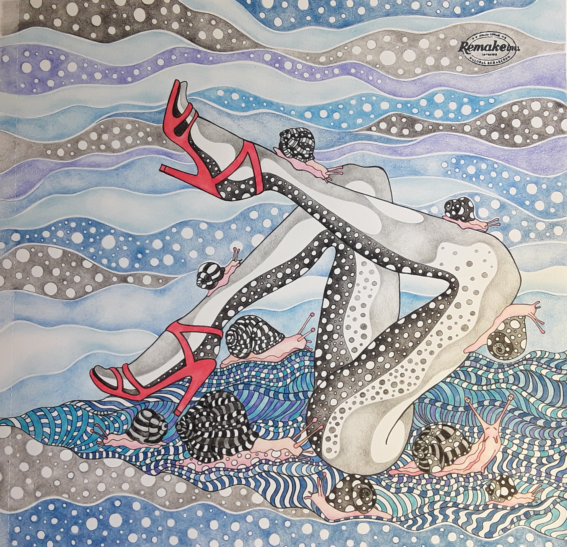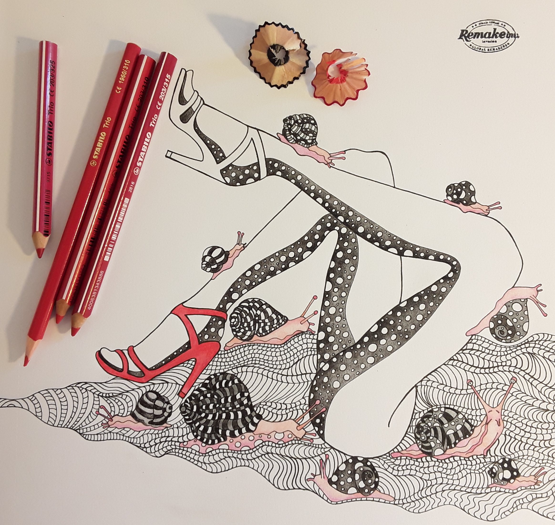 To testno ilustracijo sem si zamislila kot hladno monokromno sliko z rdečim kontrastnim poudarkom. Uporabila sem vse modre, črno in sivo iz palete STABILO Trio in Trio thick. Da sem dobila še več modrin in sivin sem barvice z nežnimi potezami mešala med seboj ter za svetljenje uporabljala tanko in debelo belo.