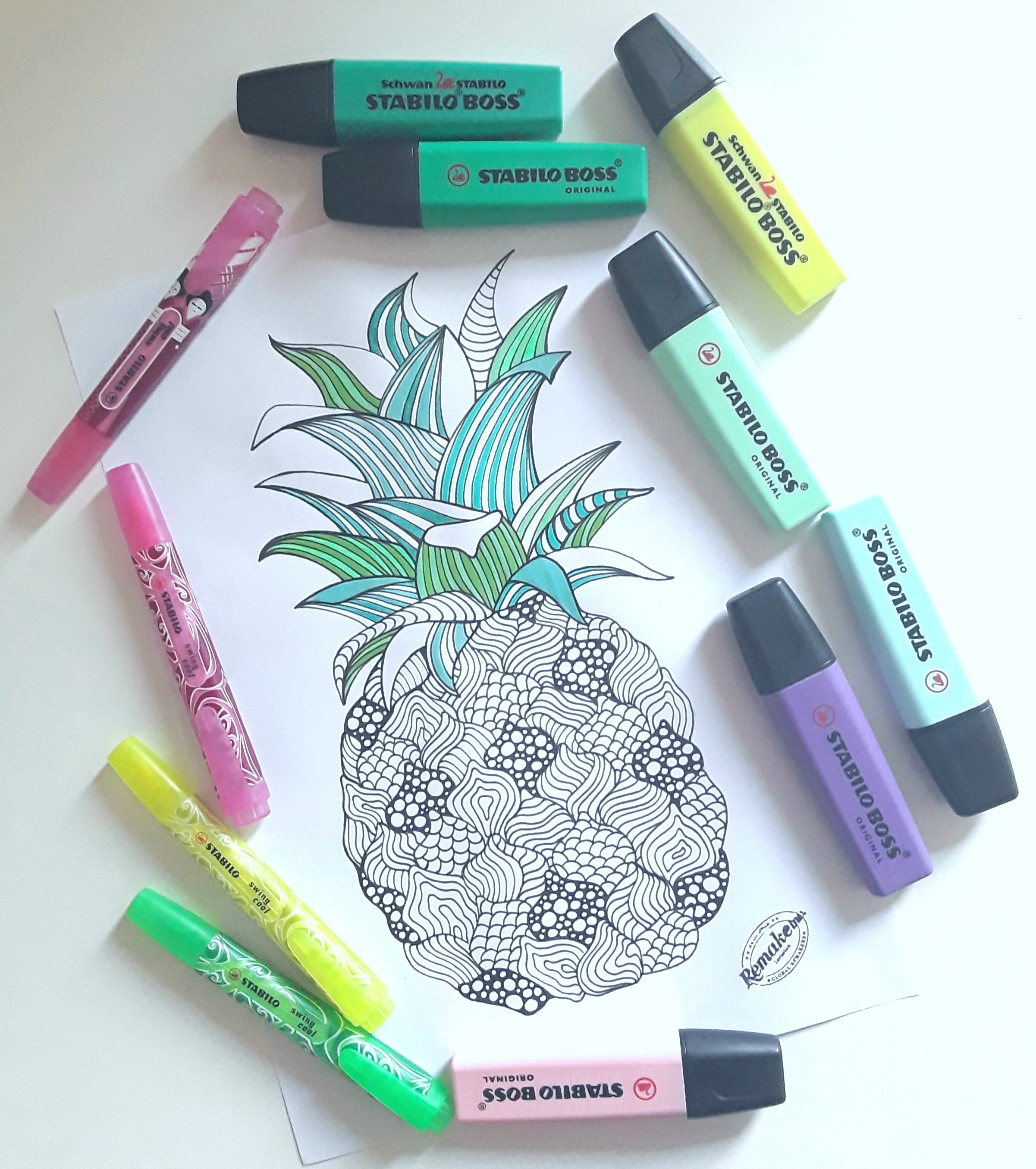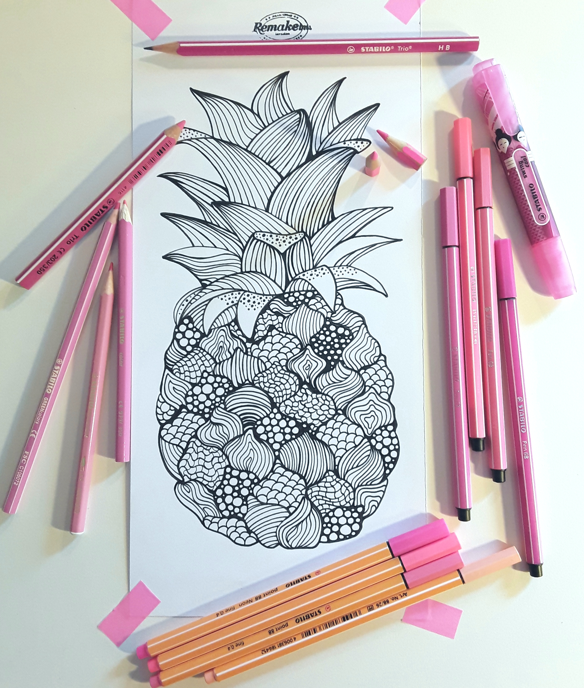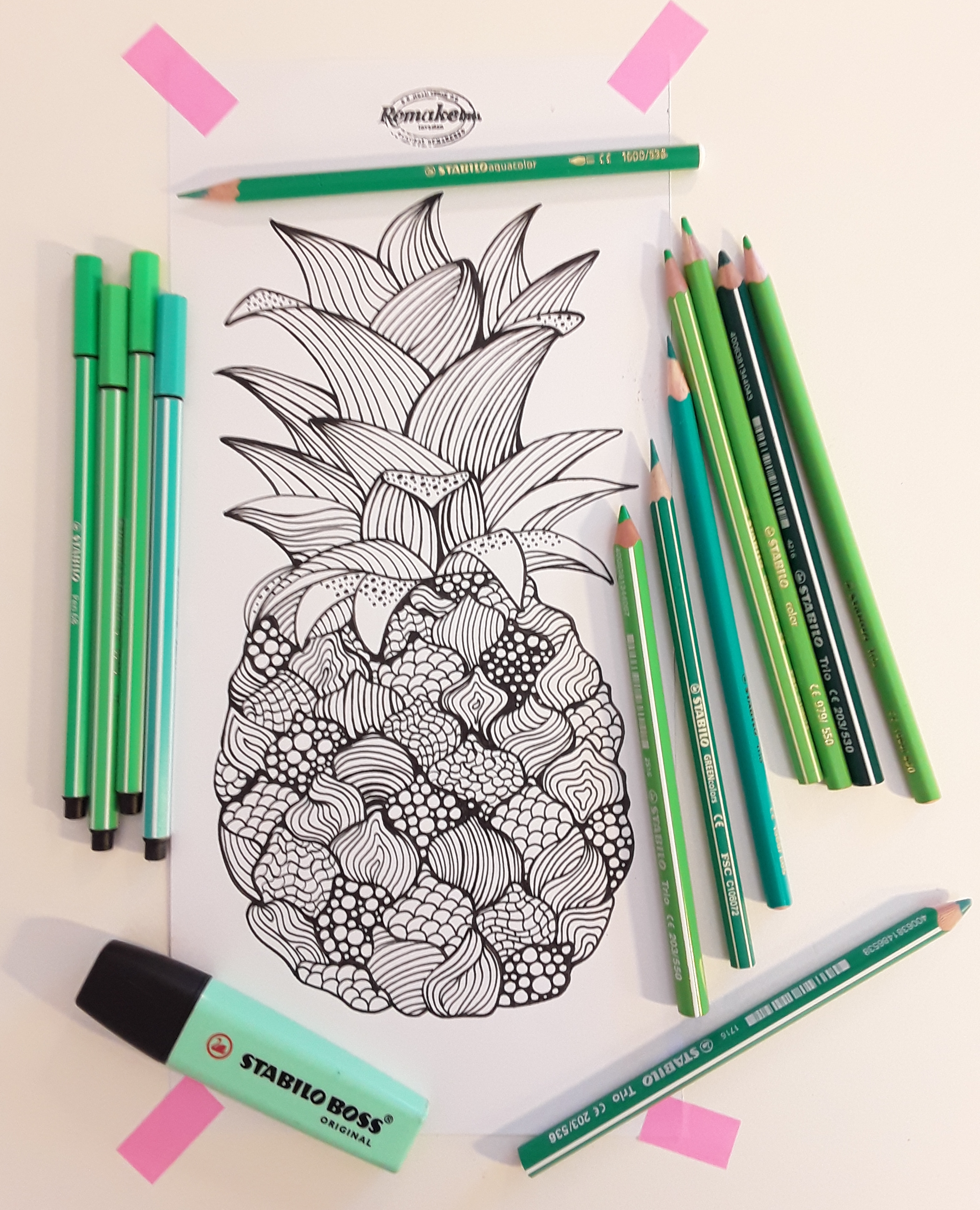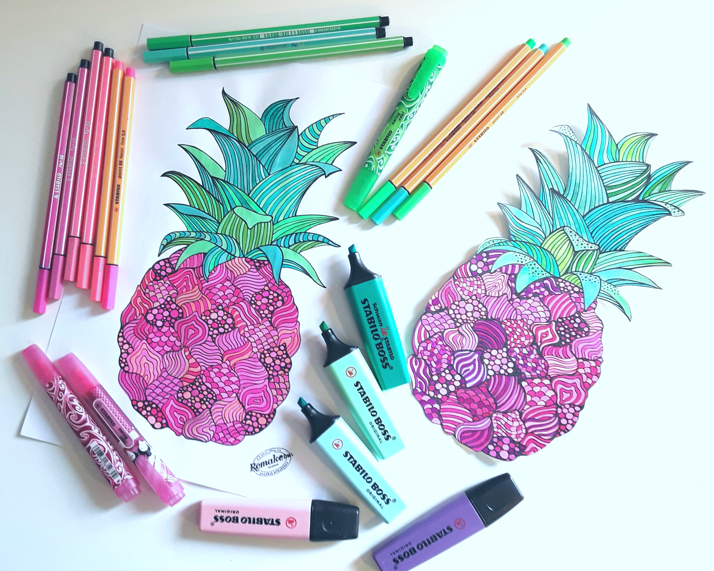 Prevroči dnevi mi kurijo možgane in besede ne stečejo kot običajno, ampak risati in barvati še vedno zmorem, ker to ne zahteva hudega fizičnega napora. Barvne kombinacije pa me celo povlečejo v neko meditativno stanje. Zamislila sem si osvežilni pinki ananas, ga narisala in iz moje STABILO lastnine izbrala vse rožnate odtenke za sadež ter vse minti zelenkaste odtenke za njegovo “pričesko”.