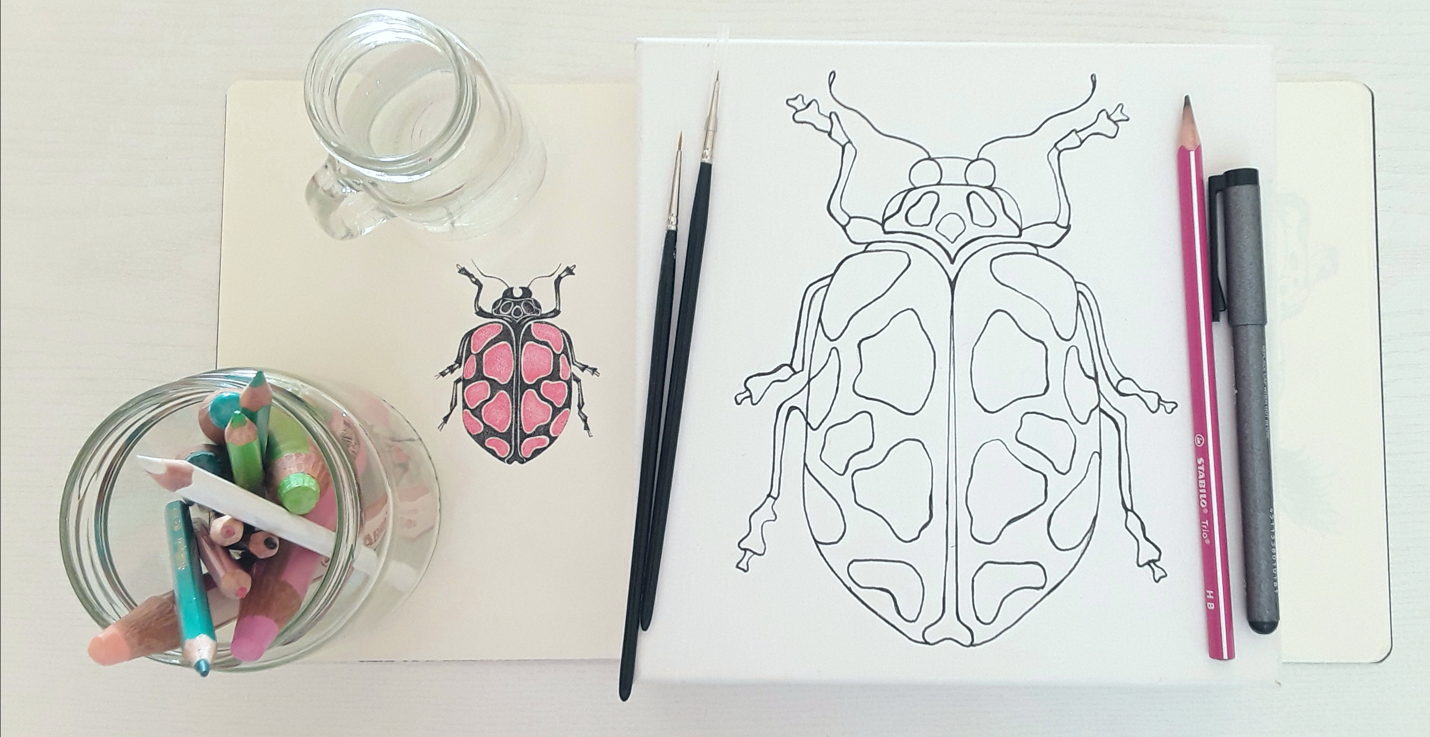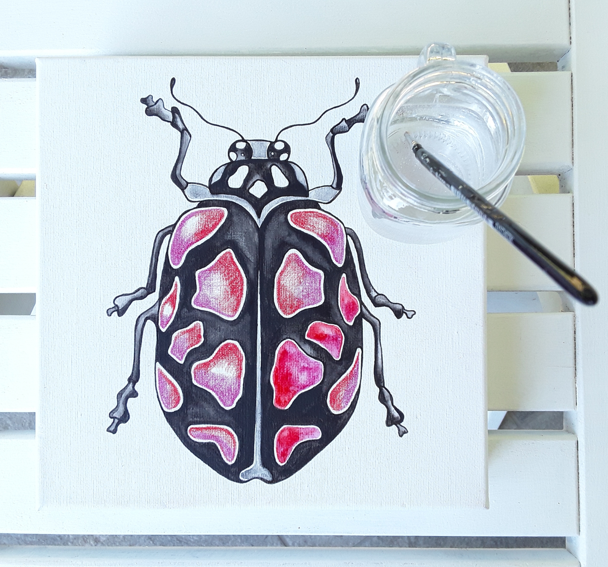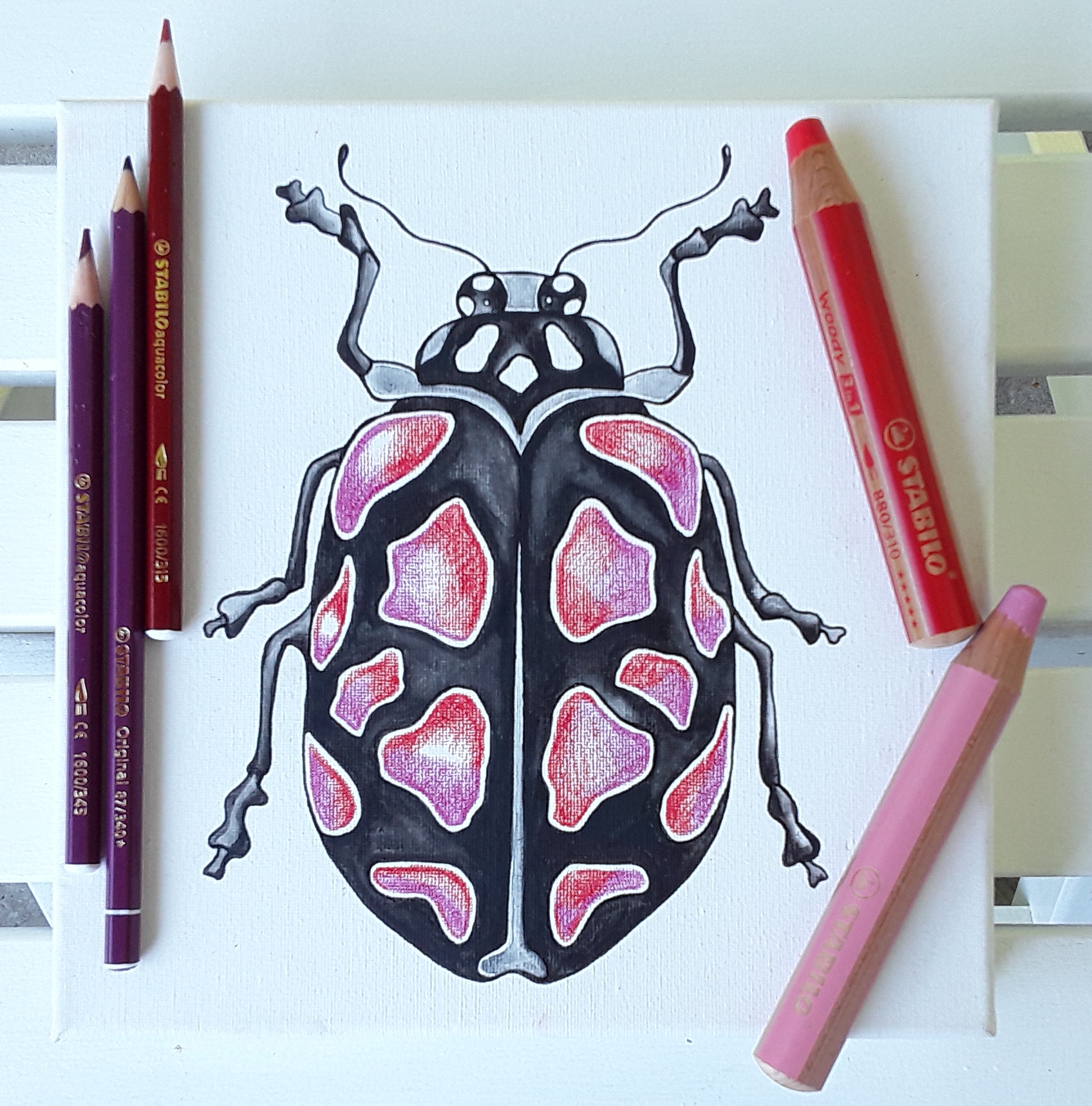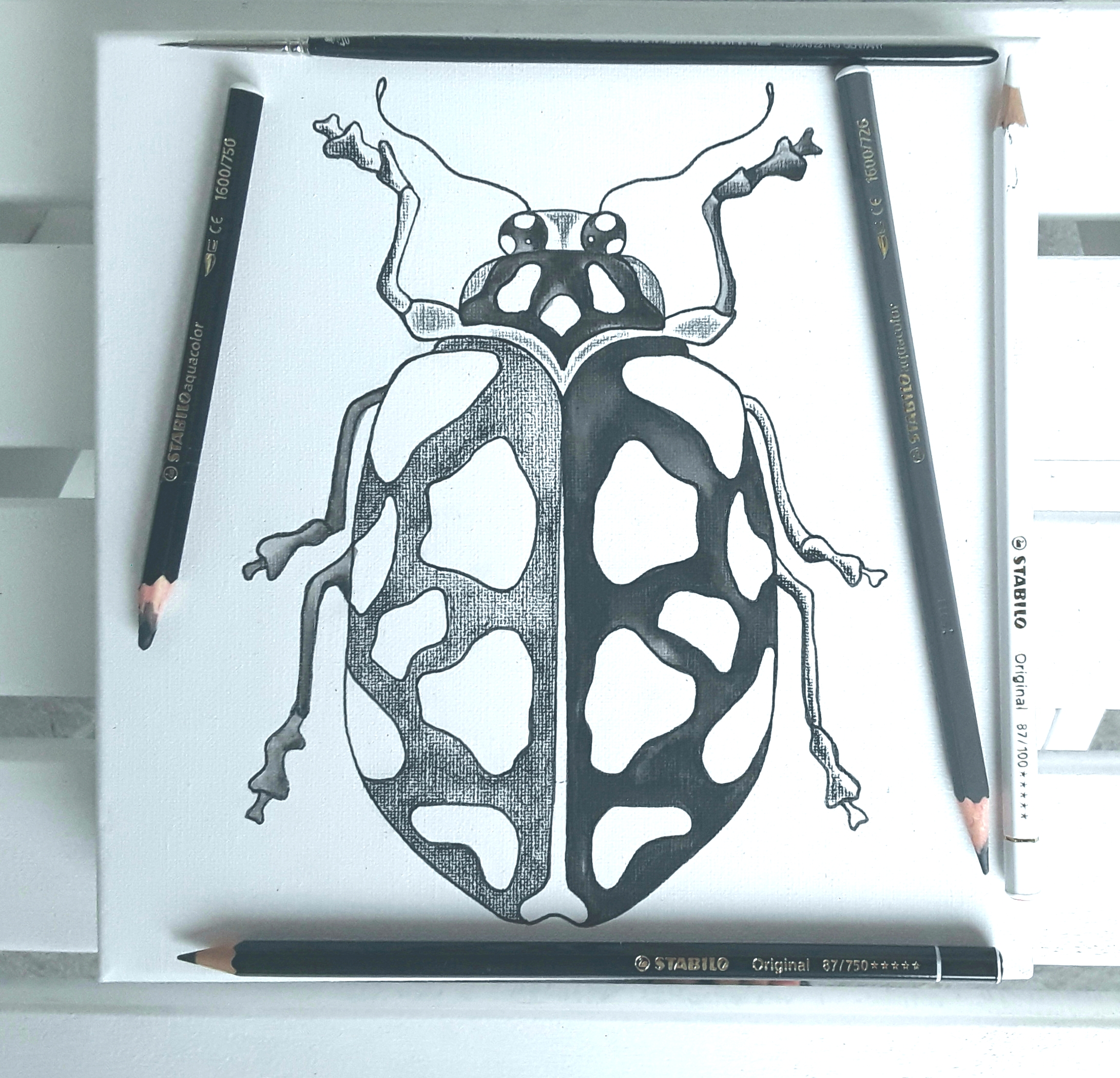 Z vodoodpornim flomastrom sem narisala risbo hrošča. Pomembno je, da v ta namen uporabimo pisalo na osnovi vodoodpornega tuša in ne običajnega alkoholnega flomastra, slednji bi gotovo s časom spremenil barvo. Izmed prej naštetih STABILO barvic sem izvzela CarbOthello, ker vem, da bi njihov precej “prašni” pigment na platnu ne imel dobrega oprijema. Uporabila sem ostale tri produkte in najprej nanesla črno barvo na obris hrošča. Za svetlitev sem dodala še sivo in belo. Barvne nanose sem razstopila z vodo, z mehkim okroglim akvarelnim čopičem ter počakala, da se zadeva posuši.