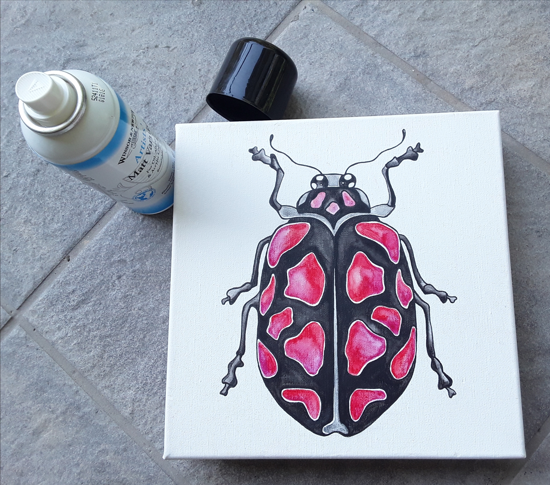 Risba (oziroma zdaj je to že slika) je lahko ta hip na videz končana. Ampak čakal me je še odločilni preizkus. Ko se je poslikana površina posušila, barve niso bile fiksirane. To pomeni, da bi se ob dodatnih slikarskih intervencijah barve lahko razmazale. Za obstojnost sem uporabila lak v spreju (mat, brez sijaja) za akrilne in oljne barve. Za tega sem vedela, da ne vsebuje agresivnih topil, ki bi sliko uničila. Seveda obstaja možnost, da bi tudi tak efekt lahko bil posrečen, vendar si na tem mestu nisem dovolila spontane reakcije. S sprejem sem lahko enakomerno pošpricala platno, če bi uporabila tekoči lak, ki se nanaša s čopičem, bi se namreč vse spackalo.