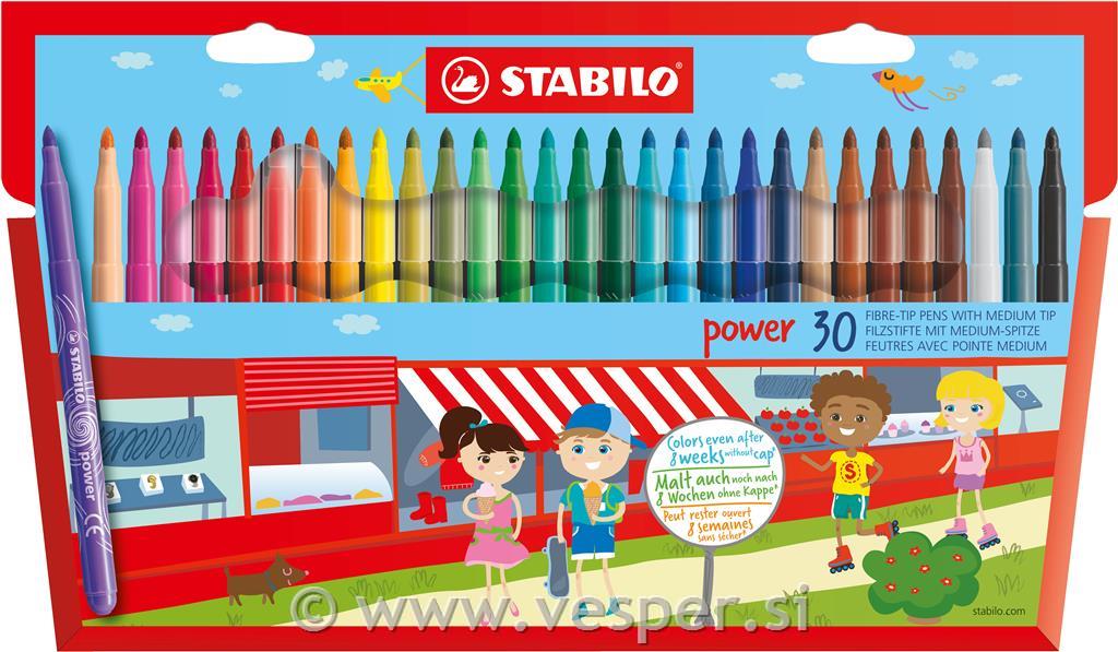 Flomastri STABILO power imajo posebno kakovostno konico. Lahko jih pustimo odprte do 8 tednov in se še vedno ne izsušijo. To je še posebej prednost, če flomastre uporabljajo tudi majhni otroci. Poleg tega je črnilo pralno tako, da bodo otroci lahko brezskrbno ustvarjali. Flomastri power spadajo med absolutno klasiko in so na voljo v 30 barvah.