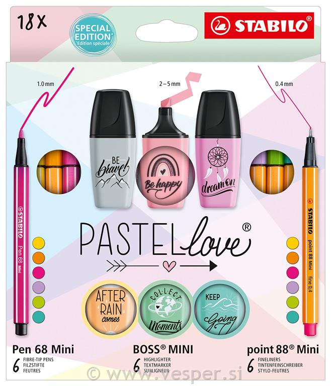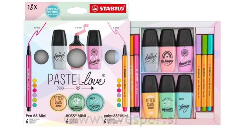 V tem paketu Pastellove so najljubša STABILO mini pisala zbrana, v lepo oblikovanem darilnem paketu. 6 kosov vsakega: BOSS MINI Pastellove 2.0, Pen 68 Mini in point 88 Mini, vse lepo razvrščeno v priloženi škatli. Barve pisal so popolnoma usklajene, dizajn embalaže pa se prav tako ujema z nežnimi pastelnimi odtenki. Tisk in pozitivne misli na BOSS Mini ter oblikovanje embalaže je ustvarila nemška pisateljica Hannah Rabenstein.