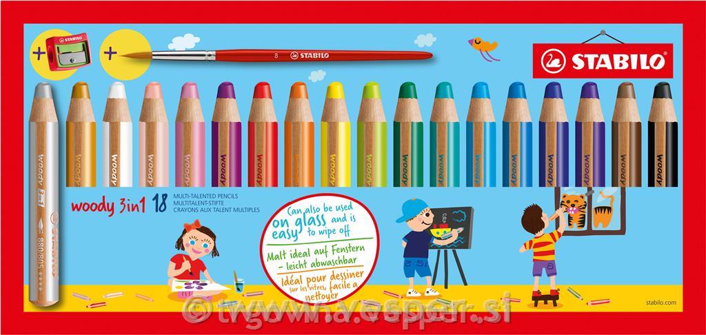 Edinstvena večnamenska barvica, akvarel in voščenka v enem! STABILO woody 3 v 1 lahko uporabljate na več kot le na papirju ali kartonu, lahko jo uporabite tudi na steklu, škatlah, ogledalih ali črnih tablah. Barvico lahko zelo enostavno obrišete z različnih gladkih površin z vodo. Barvica ponuja izjemno dolgo zabavo pri barvanju in vsebuje osemkrat več barve kot običajni barvni svinčnik! Oblika in premer STABILO woody 3 v 1 pomenita, da se odlično znajde v otroških rokah in se upre celo divjim barvnim avanturam s svojo nezlomljivo konico. Celo umetniki z visokimi standardi bodo doživeli veliko veselja s svinčnikom za več talentov, zahvaljujoč številnim načinom uporabe.